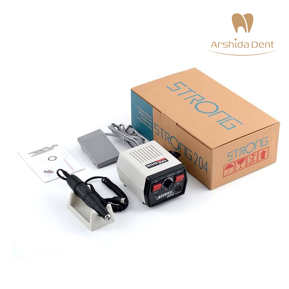 میکروموتور Strong 204 یک دستگاه کلاسیک، قدرتمند و بسیار بادوام است که به عنوان یکی از محبوبترین مدلها در لابراتوارهای دندانسازی و کارگاههای مختلف شناخته میشود. این دستگاه ساخت کره جنوبی، با عملکردی پایدار و موتور قدرتمند، برای ساعتها کار مداوم و انجام انواع پرداخت، پولیش و تراش طراحی شده است.